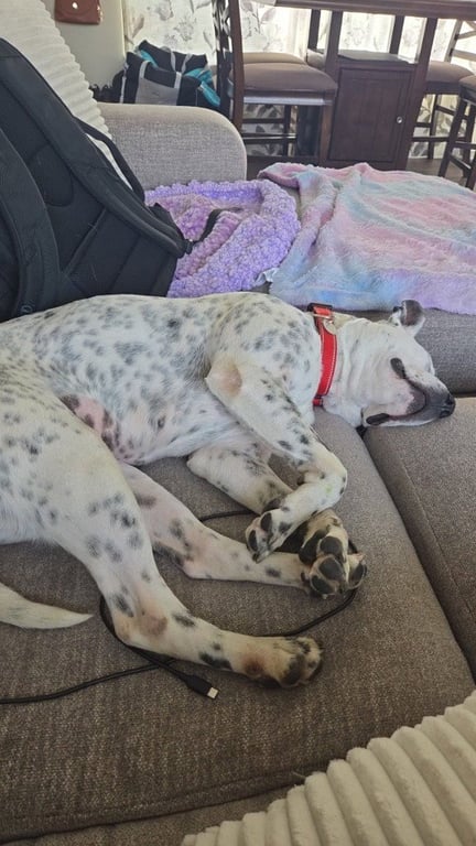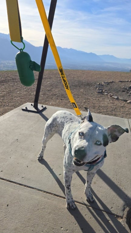 Meet Blue Cheese, a 3-year-old, 55lb terrier mix with the most striking light blue eyes to compliment her spots! She is sweet and affectionate and loves to snuggle on the couch. She is very eager to please. She enjoys daily walks, chasing squirrels, and rolling in the grass and she would apparently prefer to turn into Green Cheese - rolling in fresh cut grass is her specialty, but she also loves napping.She is quiet in her crate at night, but may show her disappointment vocally if crated during the day (she settles down within minutes though), is house-trained, loves playing chase or running zoomies and is highly food-motivated. She needs an active owner, preferably with another playful dog. She is working on her leash reactivity manners and fear of getting in cars. She is highly food-motivated and is eager to learn (and please), though she is still currently working on her basic commands. Cats are probably a no go for this gal. Blue Cheese is a charming, food-motivated companion ready for a loving home that can provide consistency and fun adventures. Dogs are not placed on a first-come, first-serve basis. We strive to find the perfect home for each animal. Applications may take up to 48 hours to process. All CAWS animals are fixed, microchipped, and vaccinated. Her adoption fee is $200. If you are interested in adopting a CAWS pet, please fill out an online application at