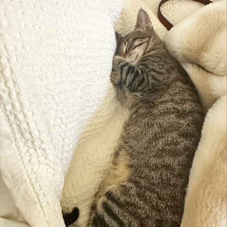 Jubileena is the perfect blend of playful and snuggly. By day, she's all about fun-especially when her favorite wand toy comes out (get ready for some impressive jumps and enthusiastic pounces!). By night, she transforms into a total cuddle bug, happily settling in with her people and purring the sweetest, most soothing little motor you've ever heard.
