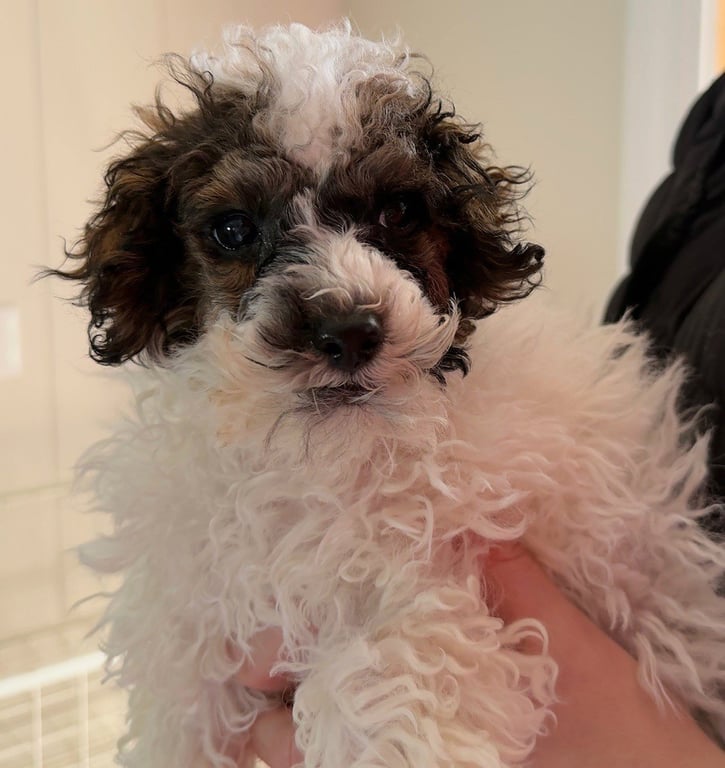Roomba is a 3 month old male Toy Parti Poodle who weighs in at 4 pounds. This pup's adoption fee is $950. If you are still interested, please read more below.