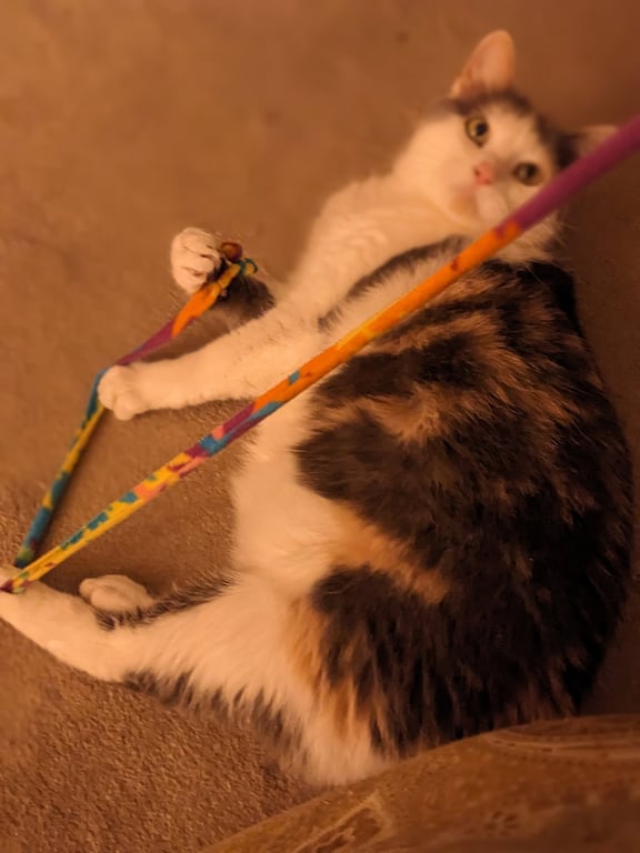 loves to play. Her favorite toy is anything with feathers that she can