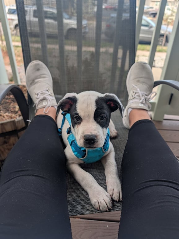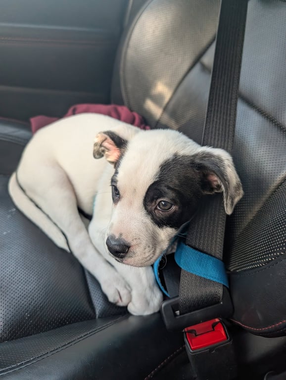 Daisy is a 9-week-old Shepherd mix weighing in at about 10 pounds, and she is everything you could hope for in a puppy-playful, affectionate, curious, and already showing signs of being an amazing companion. With her adorable white coat and black markings, she turns heads wherever she goes, but it's her personality that truly steals the show. Daisy loves to play with anything she can get her paws on-whether it's toys, sticks, or new discoveries around the house-but she's just as happy to climb into your lap, rest her head on you, and drift off to sleep. One of her cutest quirks is her signature "crawl," where she face plants and scoots across the floor in the most endearing way imaginable.