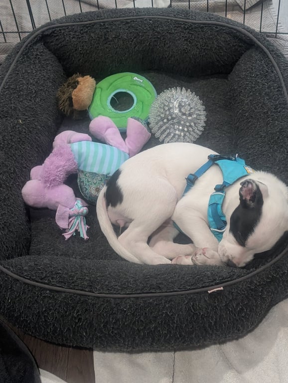 As a young puppy, Daisy is still learning all the basics. She's making good progress with potty training but will need continued consistency and patience as she grows-like most puppies, she needs to go out frequently, especially after waking up. She hasn't started leash walks just yet, but she's already getting used to wearing a harness and is taking everything in stride. Daisy is doing wonderfully with crate training, settling in easily at night and even sleeping up to 6-7 hours with a full day of play. She also does great when left alone for short periods, happily snoozing in her crate.