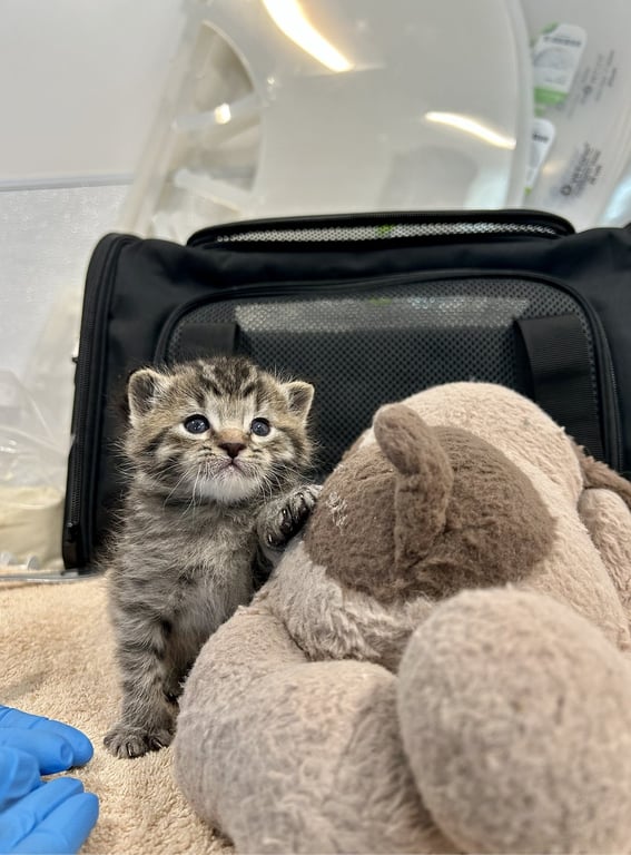 Lil Punch earned his name after arriving to rescue as a solo orphan. Just like the monkey that went viral for forming a strong attachment to his stuffed orangutan, Punch leaned on his stuff tiger for comfort during his quarantine period before being introduced to his current foster siblings. Punch is not phased by anything. This guy has an unrivaled sense of confidence and curiosity and approaches new animals, toys and situations without hesitation. He has a lot of energy, so must be adopted with another kitten to continue to develop good manners. Punch has lived with his 4 foster siblings (Pixel, Cobbler, Hickory and Butters), as well as resident adult cats and dogs in his foster home. He would do well in any home.Due to limited spay/neuter availability this time of year, Punch is awaiting his neuter surgery. He is available for pre adoption and will be able to go to a new home the first week of May.
