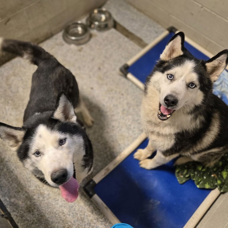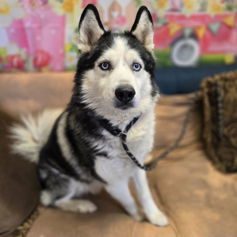 Sherlock is a 5-year-old Alaskan Malamute mix weighing in at a dashing 66 pounds of fluff, charm, and just a hint of goofball energy. This handsome gentleman keeps his kennel nice and tidy (a clue pointing toward excellent manners), and he approaches life with the kind of joy that would make even the most serious detective crack a smile.