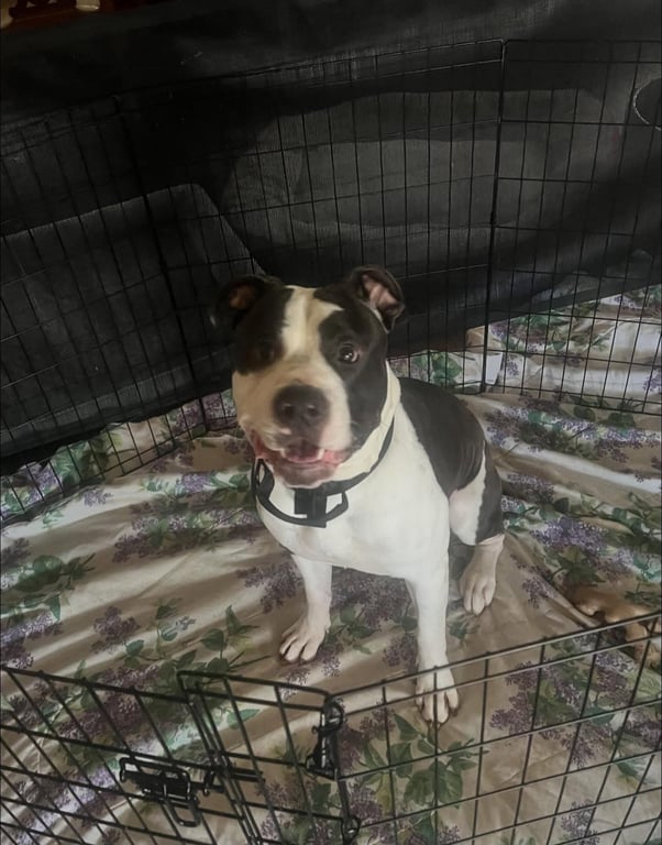 About Maverick:• 1 year old• Male Pitbull American Bulldog mix• Black and white coat• Not neutered• Current on vaccines