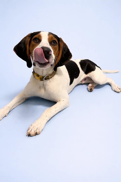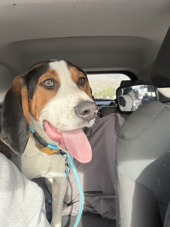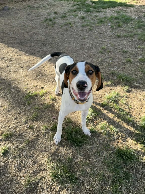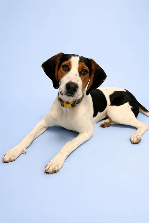 Hi, I'm Floppy! My ears may have a mind of their own, but that's just part of my charm. I'm a 10 month old Walker Coonhound, around 47 pounds now, and I'll likely top out at 50lbs of pure love.
