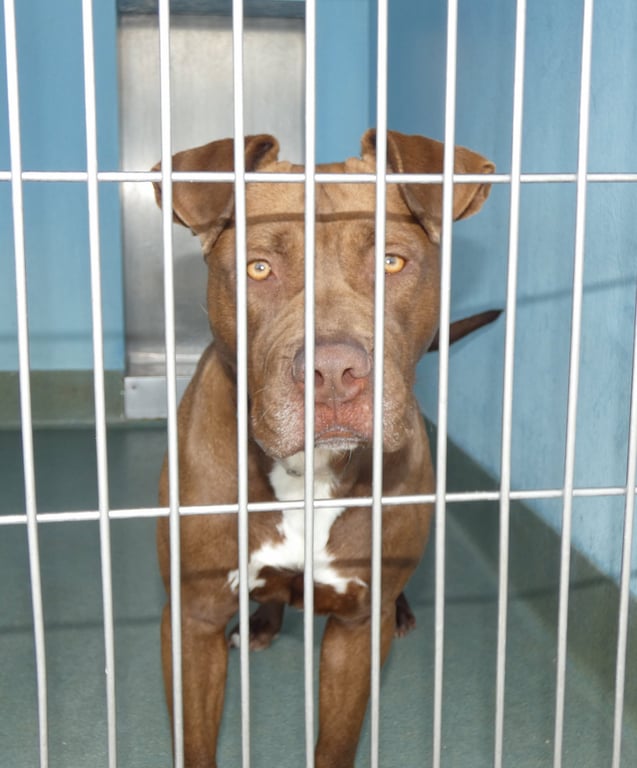 , a 2-year-old Pitbull girl who's just as sweet as her name suggests! With her soft, sleek milk chocolate coat and soulful eyes like pools of warm caramel, she's an absolute treat inside and out. Chocolatte can be a little shy in the busy shelter, but her calm, gentle nature still shines through in every interaction. She's friendly, easygoing, and happiest enjoying life's simple pleasures - like crunching a tasty snack or soaking up sunshine during a cozy nap. Chocolatte would do well with other dogs her size or larger, though she may need a bit of guidance as she continues to learn polite play. If you're looking for a loving, mellow companion with a heart as sweet as candy, Chocolatte is ready to melt right into your home!