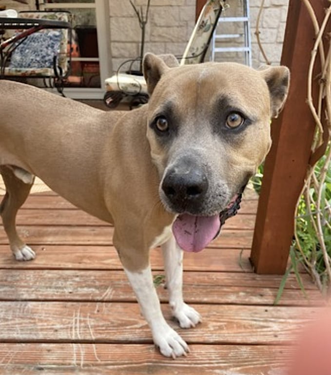 A charming six-and-a-half-year-old Boxer/American Pitbull Terrier mix currently in Austin, TX, whose essence is a lively blend of curiosity and affection wrapped in a handsome tan coat with bright white accents. He is a 65-pound bundle of energy who greets each day with enthusiasm, especially if it includes long walks, open space to run, and the irresistible promise of cheese treats!