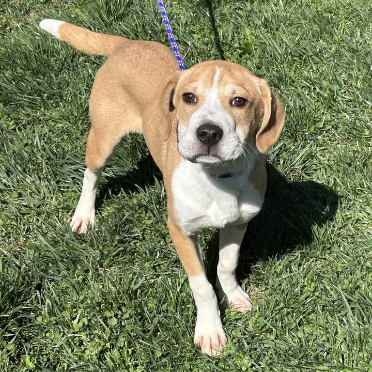BREW is an adorable 7-8 month old mixed-breed pup looking for a home. He is sweet, playful and crazy for food. Our best guess on breed is -- wait for it -- beagle/Shar Pei. That's a new one on us! He has the biggish slightly wrinkly head of a Shar Pei and the physical size, coloring and body type of a lemon beagle. Brew came to us from a rural shelter with his brother Hoss. Hoss looks more like a Shar Pei, Brew looks more like a beagle. Brew is currently 21 pounds, our best guess is he will be 25-30 pounds when fully grown. He is remarkably chill for a puppy his age. Brew doesn't have a high play motor but he loves his squeaky toys. When playtime is over, Brew is happy to cuddle and nap. Brew is a bit on the shy side and does enjoy the companionship of other dogs. He would benefit from having another fur sibling. If you'd like to meet Brew, please fill out a dog adoption application at