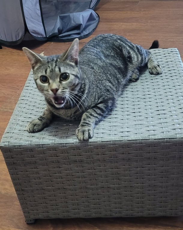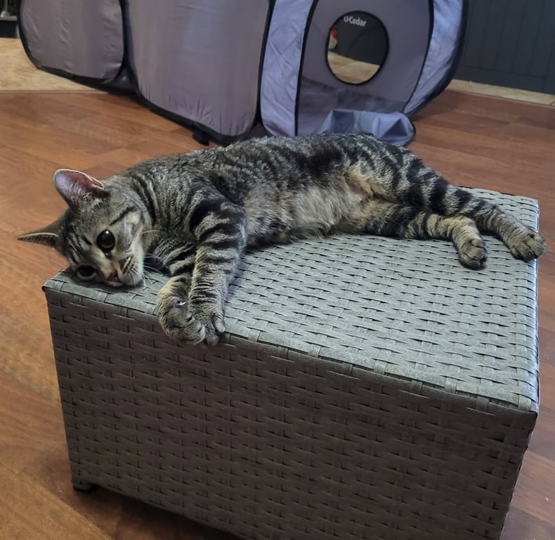 Ivy is a little vine that grows into your heart. Meet Ivy, a graceful green-spirit girl who loves to wander, explore, and quietly bloom wherever she's planted. Like her namesake, she thrives with a bit of freedom - she enjoys free-roaming the home, finding cozy corners, sunny spots, and soft beds where she can curl up and recharge. Playtime is one of Ivy's favorite ways to grow her confidence. She enjoys toys, climbing cat trees with scratching posts, and keeping watch over her space like a gentle garden guardian. She's also wonderfully useful around the home - a natural little pest patroller who takes her job seriously. Ivy is affectionate in her own sweet way. She enjoys pets, loves to rub against her people, and will happily share quiet companionship. She's comfortable around dogs (though she prefers not to interact much) and isn't bothered by everyday household sounds - even the vacuum doesn't wilt her spirit. She has a hearty appetite, enjoying both wet and dry food, and she drinks well from a dish while learning to use a pet water bottle. She reliably uses kitty litter or pellets and appreciates having food and water available to nibble and sip at her own pace. Ivy is crate trained, though she's clever and curious - any crate must be securely fastened or she may "grow" her way out. She can be quite vocal when confined, politely letting you know she prefers a little more room to roam. Having raised two litters in a short time, Ivy is ready for a calmer chapter where she can simply be cared for and cherished. She may need patience with other cats, as she has been known to chase them off in the past. Ivy would flourish in a loving home that allows her to settle in gently, stretch out comfortably, and put down roots at her own pace. With kindness and care, this resilient little vine will wind her way right into your life. Ivy is up to date on vaccines including rabies, tested negative for FELV/FIV, dewormed, spayed and microchipped. Her adoption fee is $180.