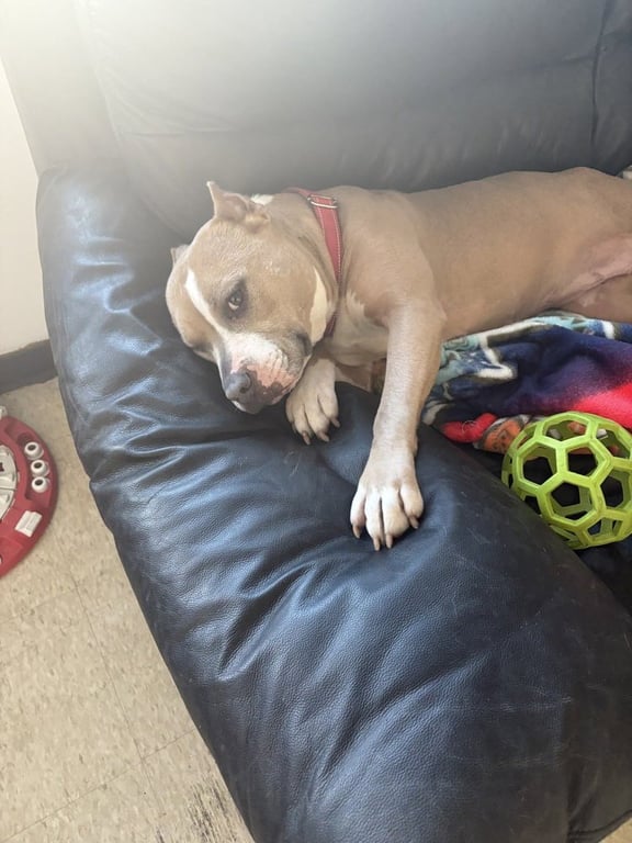 *Name: Eliana*Age: 4 years old*Current Weight: 47 lbs *Adoption fee: $475 Eliana's eyes tell a story. A story of strength, perseverance and a willingness to survive. Someone bred Eliana for the sole purpose of making puppies for money. They cut her ears, starved her and bred her over and over against her will. Then.. they threw her away. Eliana was found skin and bones seeking refuge on a couch in a pile of garbage on the side of the road. None of us can even begin to fathom what Eliana has been through. This delicate and precious little soul has been abused and failed by humans over and over.. yet somehow she still loves and trusts us. Many months after being rescued from that dirty old couch, Eliana has blossomed into a mature, healthy, thriving dog now and she is so beautiful inside and out!She's a stocky, teeny, tiny, itty, bitty, pittie weighing only 45 pounds! Dainty and adorable, Eliana is an easy going girl who really doesn't ask for much! She walks with her head held high and booty swaying from side to side. A cozy home with trusting people to cuddle up alongside with few walks around the neighborhood each day and Eliana will be a happy camper! Eliana prefers a home without other dogs right now. After being force bred for so long, we have realized that direct contact with other dogs cause stress for her. She minds her own business when walking by other dogs on the street, which is a great quality! Eliana sits on command, comes when called and hardly ever pulls on the leash. Shes basically perfect!! Eliana is ready to finally live a life of luxury and kindness. We all know she deserves that and more! Come to meet her and be prepared to have Eliana completely melt your heart. To apply to adopt, fill out an application at