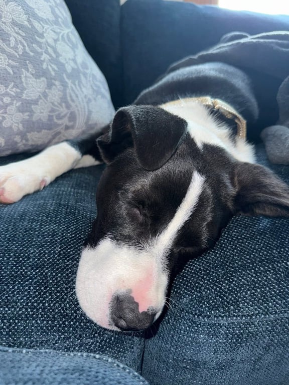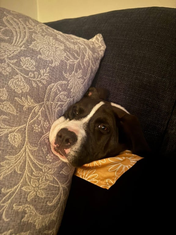 She's doing incredibly well and is eager to keep learning. She enjoys going for walks, rides calmly in the car, and even handled her first pedicure like a pro. While she's a taller puppy, she still needs a little boost to get onto the couch. She plays nicely with both small puppies and larger dogs, getting along well with dogs of all sizes. It's hard to imagine not wanting this sweet, loyal panda girl in your home to love!