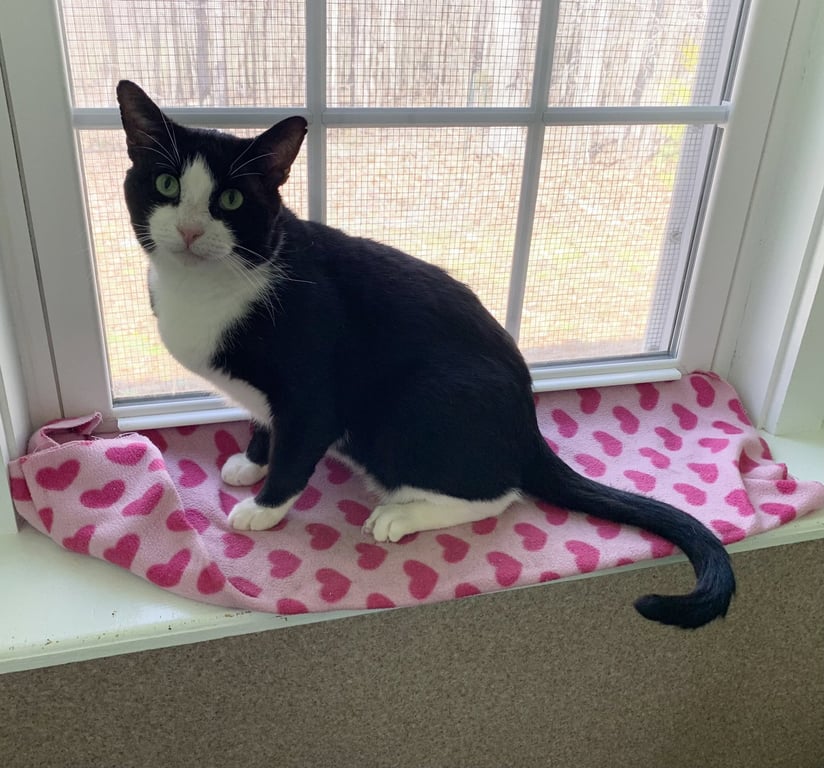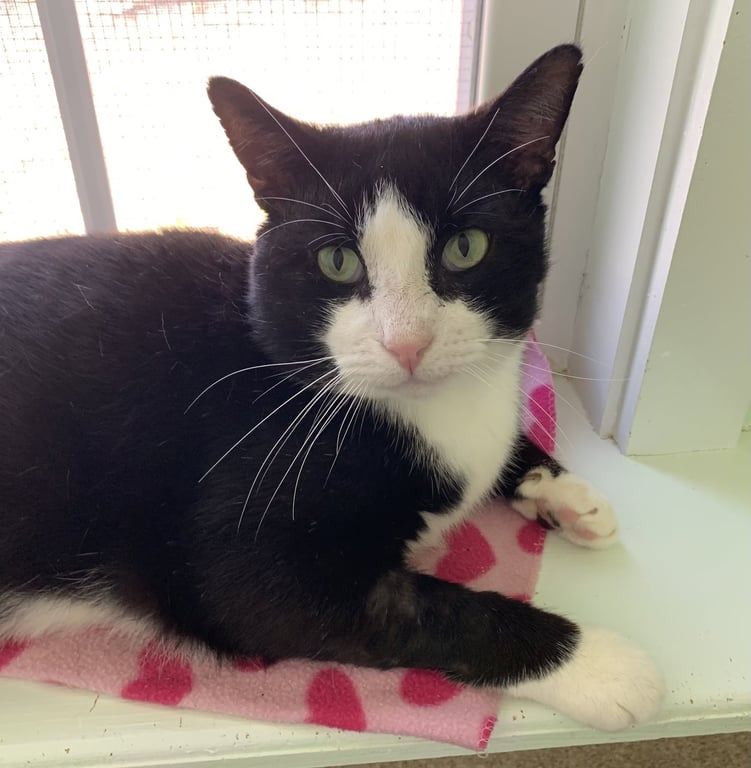 Meet Usher, a big handsome tuxedo gentleman dressed to impress in four white socks and a dapper white bib. His gorgeous green eyes are sure to steal your heart-but it's his loving personality that will truly win you over. Usher is all about affection. He will greet you at the door like a loyal friend, then happily rub you to say hello. A true lap cat, he adores snuggling, soaking up pets, and filling the room with his constant purrs. While he enjoys playing with wand toys or chasing the red laser dot, Usher is definitely more a lover than a player. Once an outdoor kitty, Usher is now ready for an indoor home where he can share all the love he can give. He gets along well with other cats and would thrive in a home where he can be part of a family and shower his humans with affection. Usher has a birthdate of 1/28/2023, neuter and up to date on vaccinations. He is FIV positive, but that just means he deserves a little extra care and an indoor life- something he will repay with endless affection and companionship. Cats with FIV can live many healthy years and FIV cannot be passed on to humans. Usher would be the perfect family or companion cat. Come meet Usher-you won't be able to resist his charm.