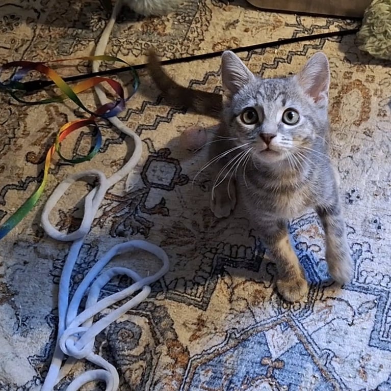 Jennifer Juniper is a vibrant, loving kitten who brings joy and energy to every room she enters. Why Jennifer Juniper is Special: Jennifer is the perfect blend of affectionate and playful. She loves nothing more than interactive play sessions and would absolutely thrive with a feline friend to chase, wrestle, and explore with. Her beautiful coat catches the light as she bounds around, showing off those gorgeous silver highlights that make her truly one-of-a-kind.