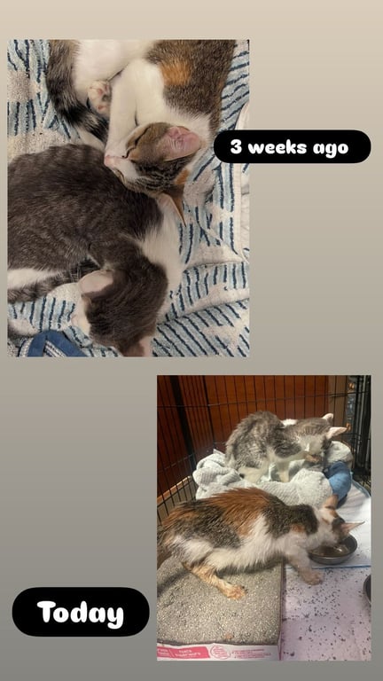 Spirit and Phantom came to us after a heartbreaking ordeal. Originally adopted out through another rescue, their new owners tried for weeks to return them when one developed mild tummy trouble (likely just from a change in food) - but their calls went unanswered. In desperation, the pair was kept confined to a single small carrier, all day, every day. These babies sat in their own mess, fed only rice and chicken, and slowly wasted away. By the time they were finally surrendered at one of our PetSmart locations, Spirit and Phantom were severely malnourished - skin and bones - and, astonishingly, UNFIXED at seven months old (it's a miracle Spirit wasn't pregnant!).