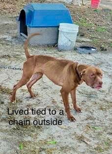 This is Shelby - an apx 5-6 y/o , 40-ish lbs., sweet and gentle girl who was seized in a CRUELTY CASE where she spent her life tied outside on a chain!