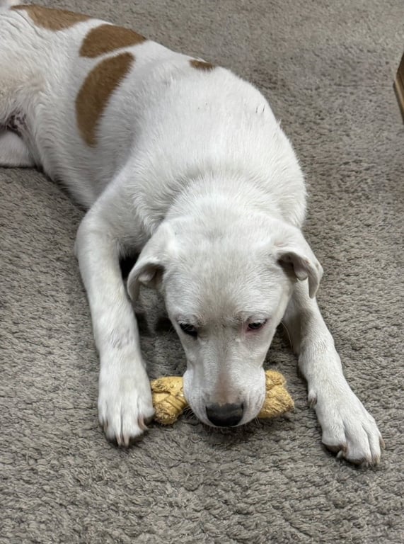 She came in a bit scared and shaking but after a proper dog intro in her foster home, she was fantastic with the resident dogs from 35 to 160 pounds! Millie now plays happily every chance she gets with her furry foster siblings, loves her toys and bones, is 100%% ready for snugges and kisses with her foster family including children at any time!