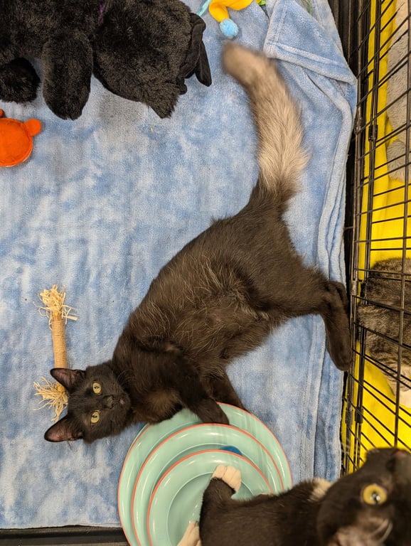 Meet Ghost. He is a little cautious, but friendly. He has the most unique fur coat. As you see in the pictures, his tail and his under underside have white in them and this beautiful fluffy tail.